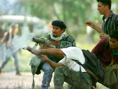 students fire thier home made black powder mortars at police durig riots in Managua. Students confronted Nicaraguan law enforcement forces for three weeks demanding better funding for the universities. |